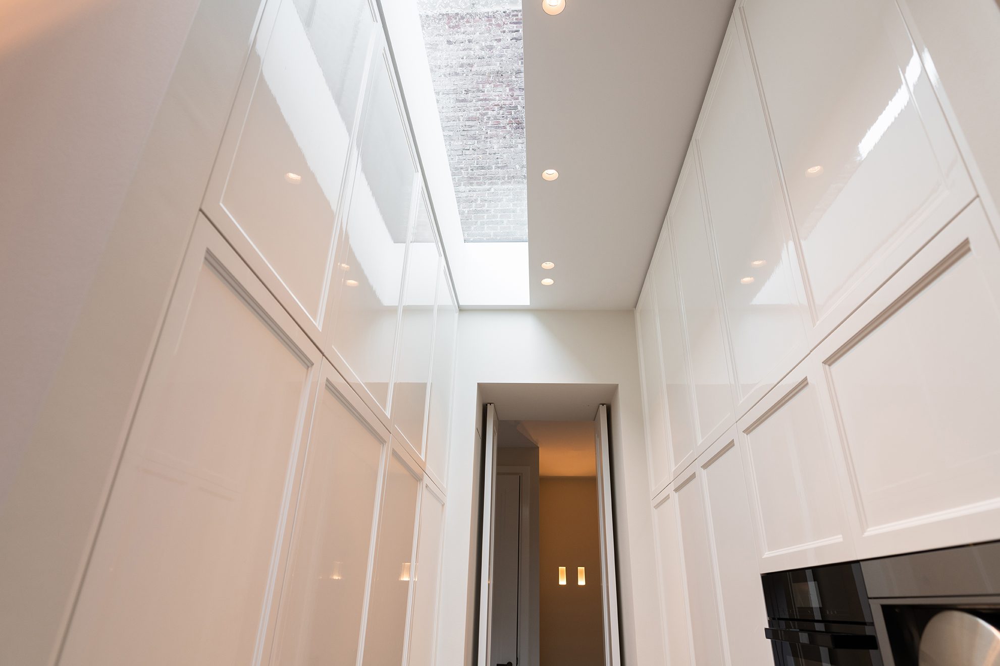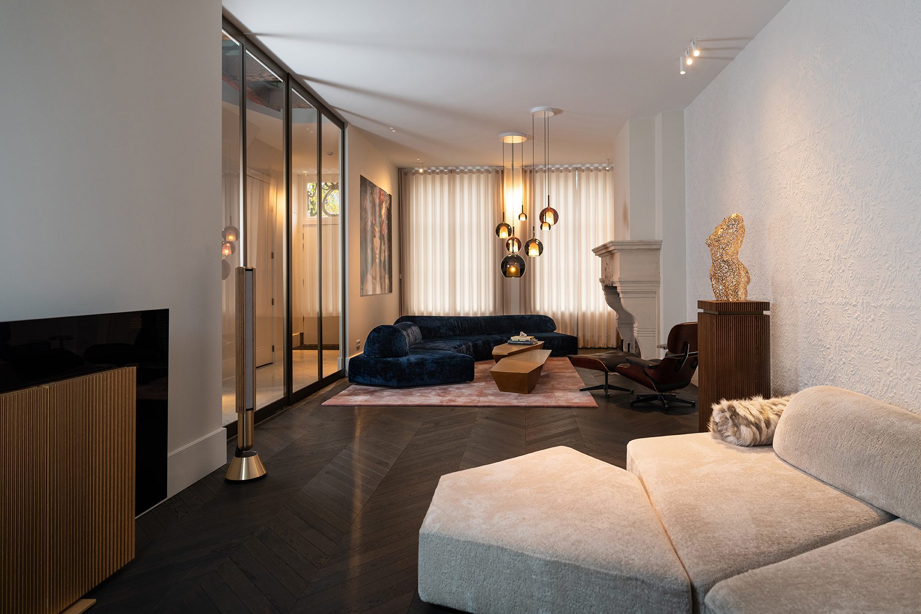 Het resultaat is een verfijnde balans tussen het oude en het nieuwe. Dankzij de integratie van de nieuwste technologieën voelt het pand nu als een eigentijds thuis, terwijl het monumentale karakter intact blijft. We werkten met precisie, van het plannen van het verlichtingstraject tot het afstemmen van de domotica voor de perfecte gebruikservaring. In de woonkamer hangt de Glo van Penta, een lamp die als ware eyecatcher de ruimte verlicht, en boven de eetkamertafel schitteren de Leaves van Sipek en Spalek. Dit alles vormt een verlichtingservaring die zowel de architectuur als de moderne technieken respecteert. Zo blijkt maar weer: technologie kan de schoonheid van een monument versterken, zonder de ziel ervan te verliezen. Het interieur is een ontwerp van Luzano.